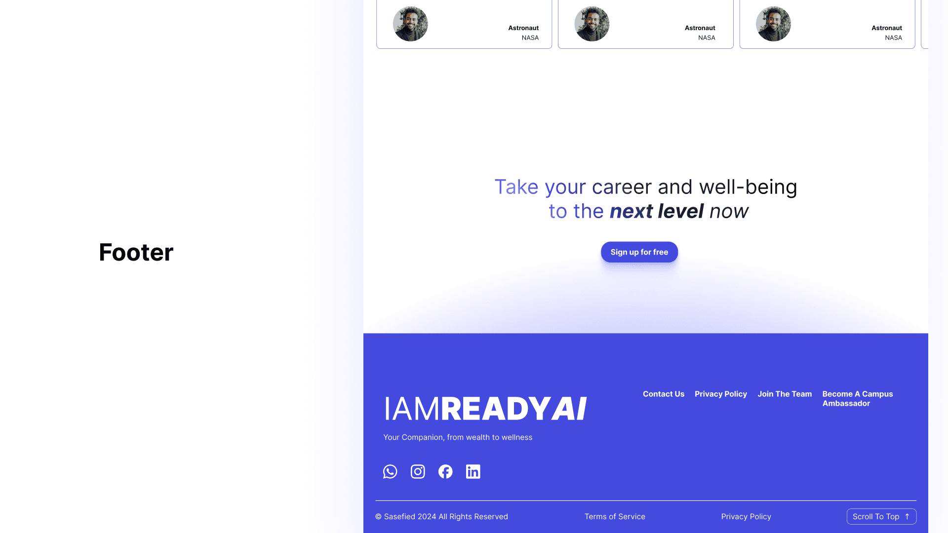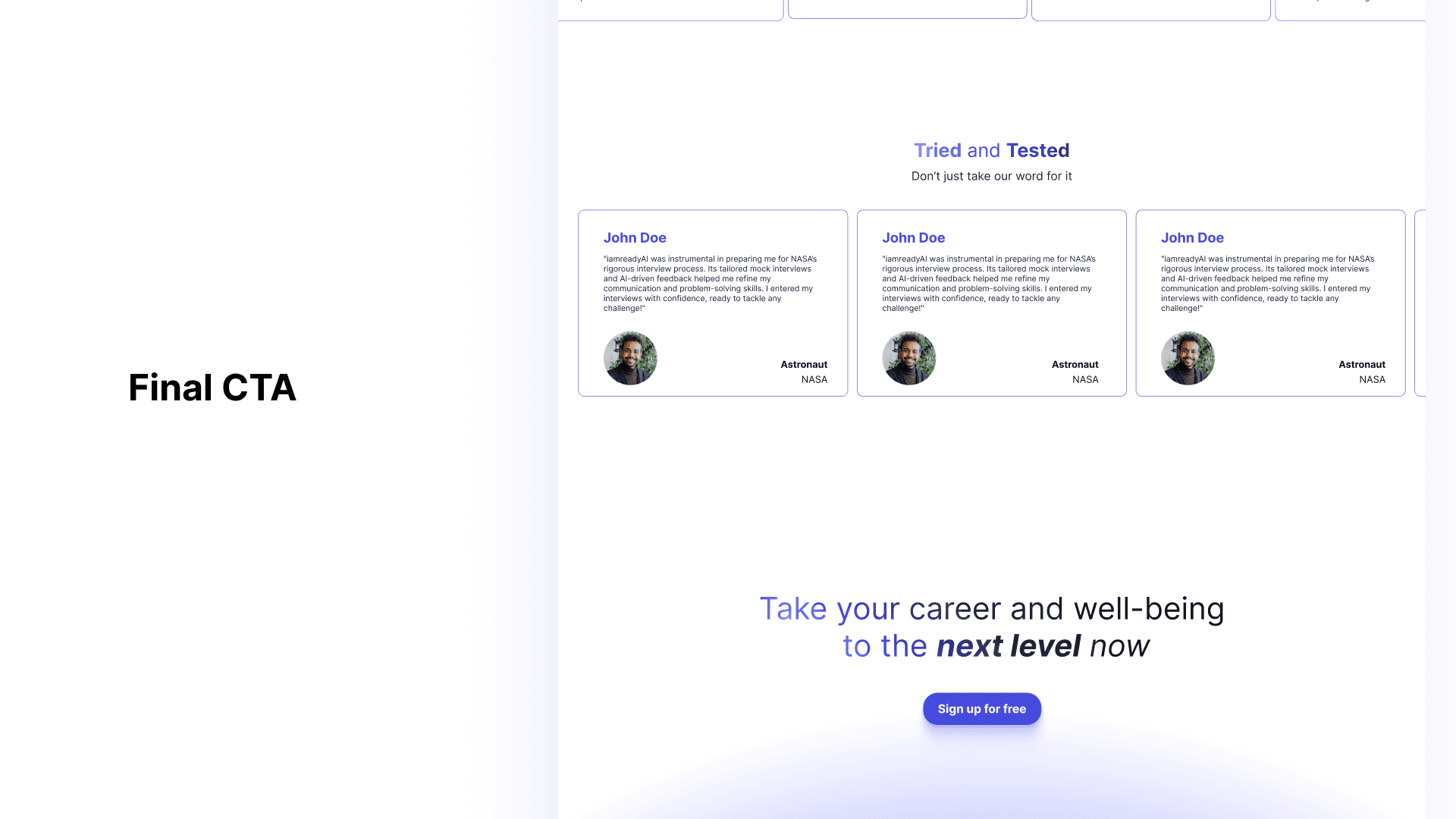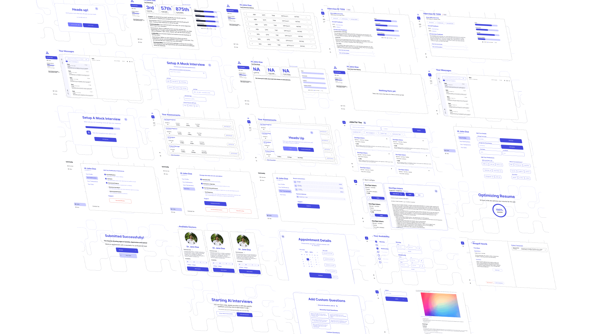 For IamReadyAI, I adopted a user-centric approach by first defining core user personas—students, recruiters, and mental health professionals. I then developed tailored user flows for each group, ensuring their unique needs and objectives were addressed effectively. Consistency in visual design and interaction patterns was maintained across all flows to deliver a cohesive and intuitive user experience throughout the platform.