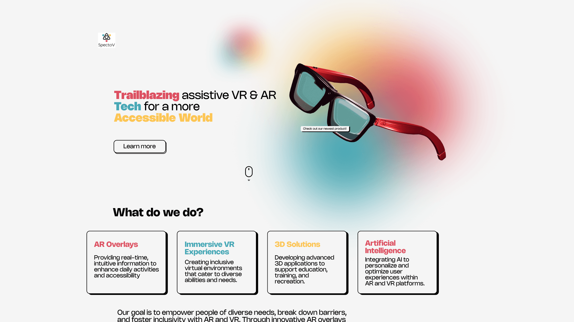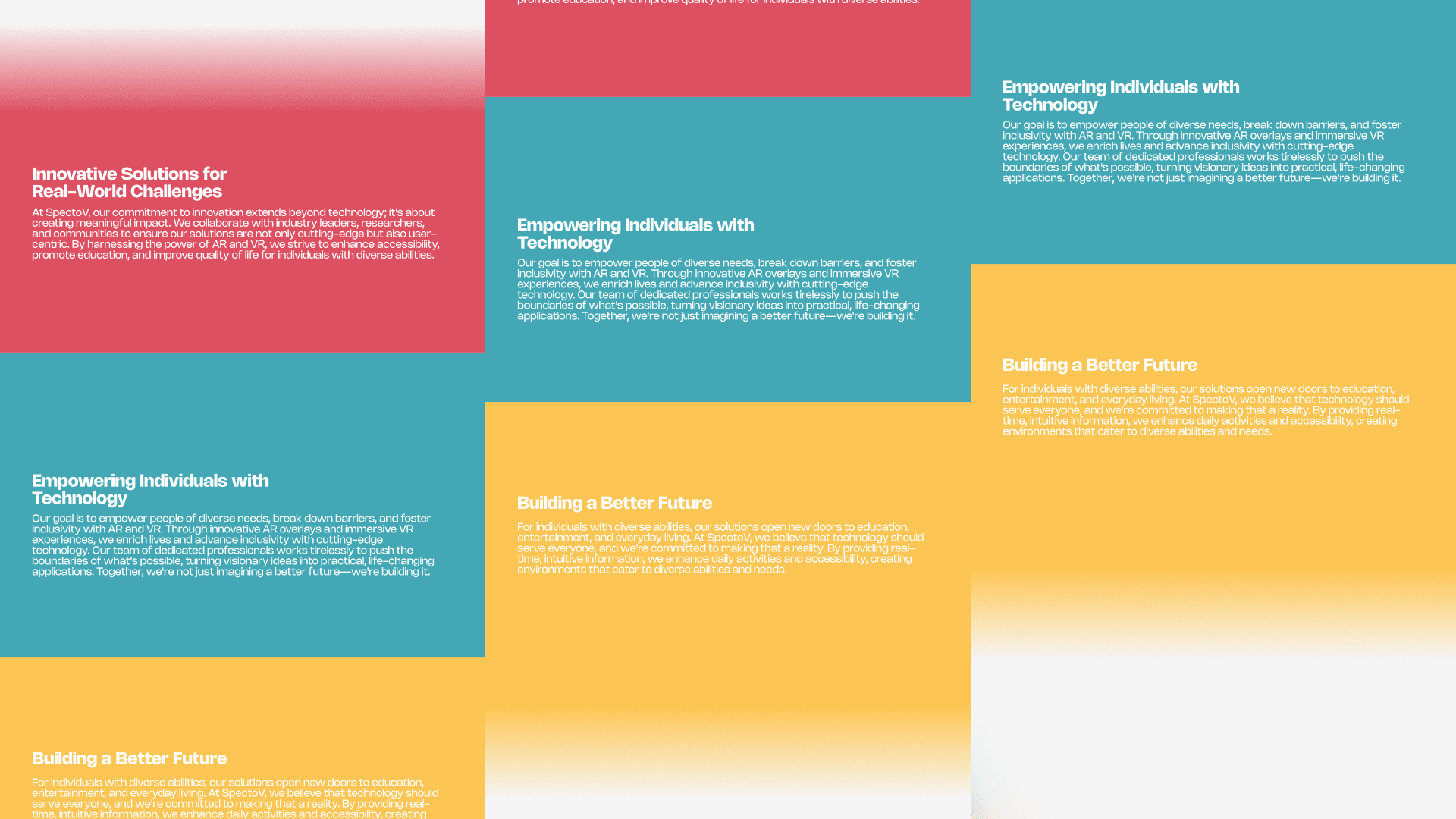 SpectoV is an AR/VR startup turning accessibility challenges into immersive solutions—think real‑time sign‑language translation and guardian‑assisted play spaces. The site I shipped tells that story in one fluid scroll: a punchy gradient hero, four feature cards, impact blocks in bold color bands, and friction‑free CTAs that speak to users, partners, and donors alike.